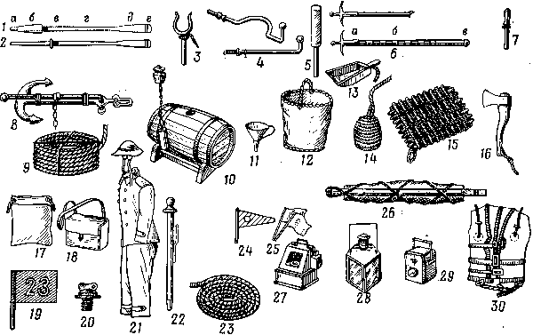 1 - весло вальковое (а - руль; б - валёк; в - кожа; г - веретено; д - лопасть; е - оковка);