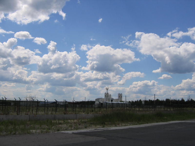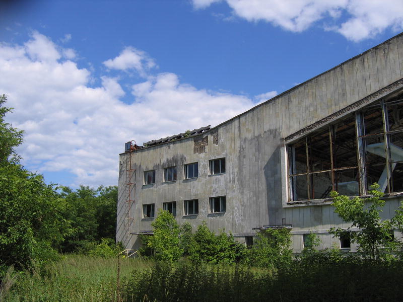 Уже за границей города расположена заброшенная сейчас перевалочная станция. Чтобы не развозить колёсами радиоактивную пыль, тут перегружали бетон с "чистых" самосвалов на "грязные".