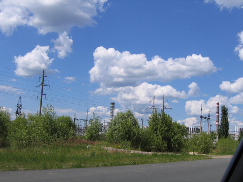 Подъезжаем к ЧАЭС — подстанция и переезд через мостик — уже видно четвёртый энергоблок с характерной легко узнаваемой трубой и Саркофаг над ним.
