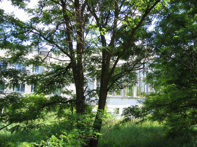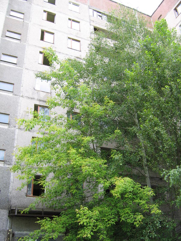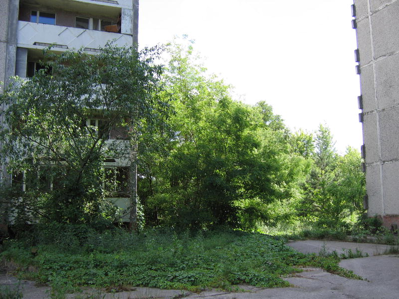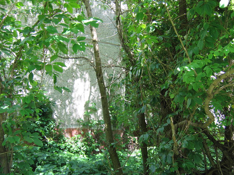 А вот так эта растительность выглядят вблизи. Джунгли самые настоящие. Дикие, непролазные. С густым подлеском, вьюнами и бурьянами. Сразу видно, что это выросло само, человек руку не прикладывал. Продраться через такое непросто. Но мы и не лезем. Если проезжую часть улиц ещё в своё время дезактивировали — поливали дезактивационными растворами, чтобы связать и смыть радиоактивную пыль, — то остальное может и не трогали, кто его знает что тут и как фонит.