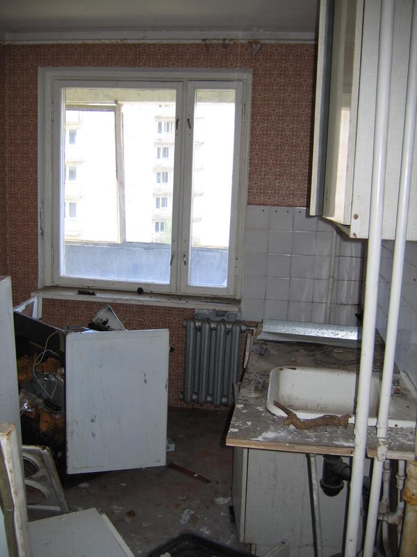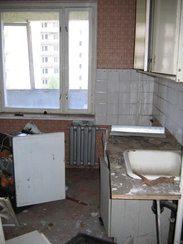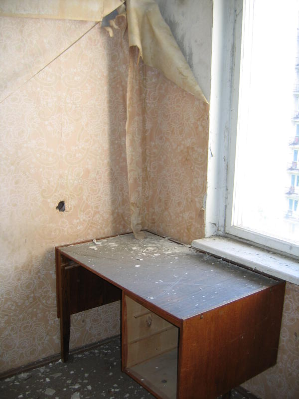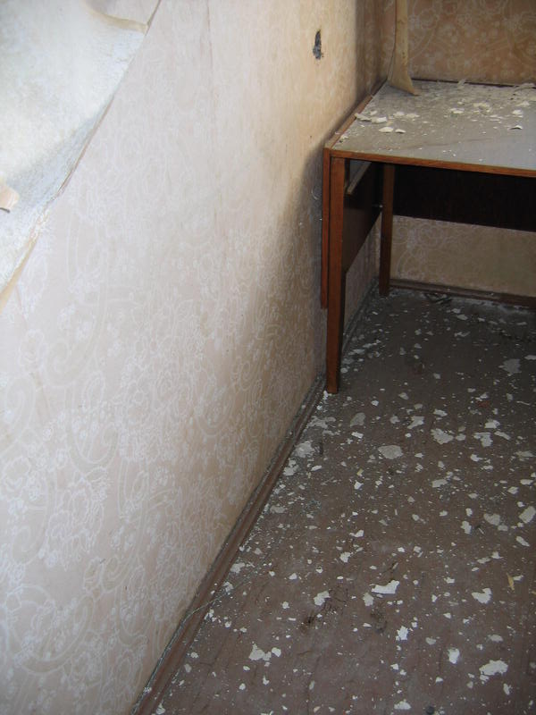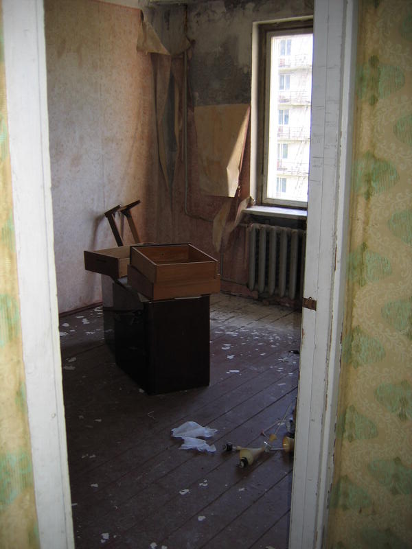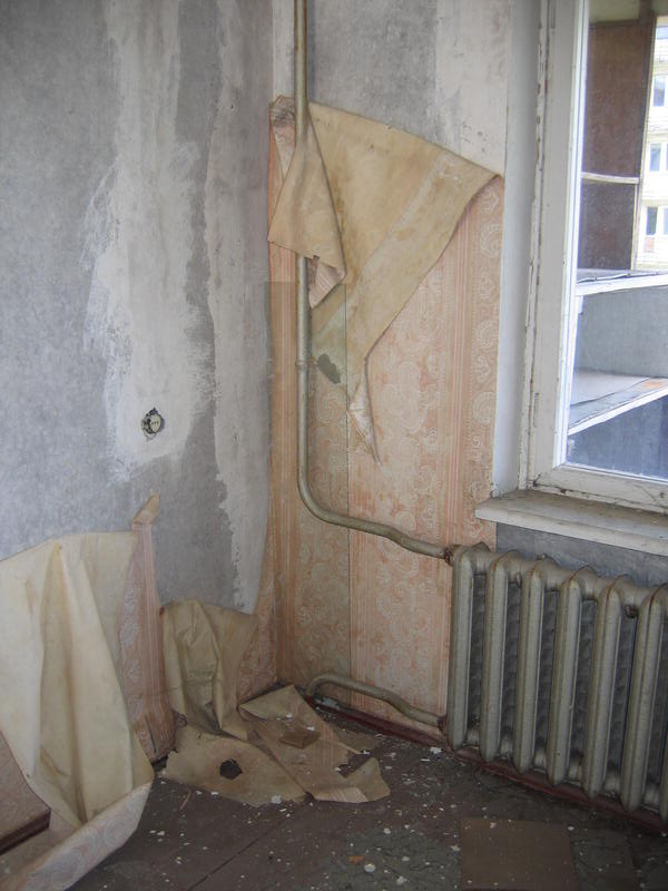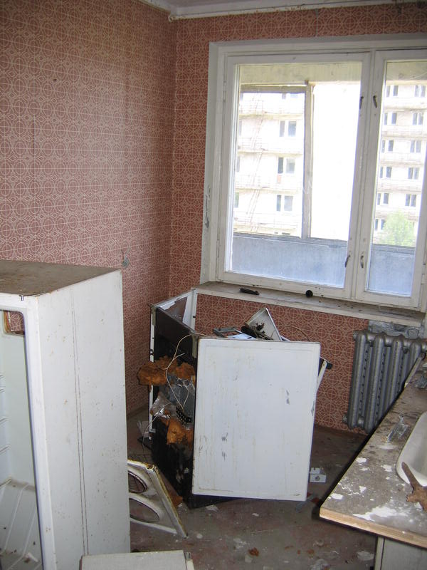 Мебели почти нет, её специально выкидывали или ломали до некондиционного вида, чтобы у мародёров не было соблазнов вывезти и перепродать. Сами небось бы не пользовались, потому что вывезти не запачкав — почти без шансов.