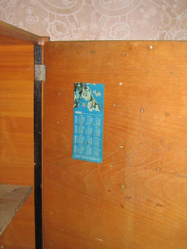 Шкаф, за ним кровать. На шкафу остался висеть календарик за 85-й год. На полке лежит одинокий крючок, обломок колеса от маленькой машинки...