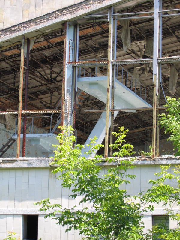 Бассейн тоже обветшал и разваливается. Какое-то время после аварии его поддерживали в рабочем состоянии, рабочие смены со станции могли сходить и поплавать. Потом бросили, вот что получилось. Вышка, часики...