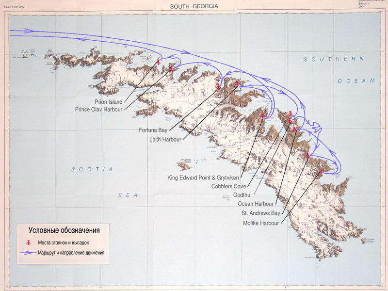 Путешествие на Южную Джорджию или в гости к пингвинамО поездке в целомСамо путешествие было предпринято в марте 2006 года. Основных идей было две: попасть на Южную Джорджию, сделать это под парусом. Организация экспедиции была довольно сумбурной, потому что сама идея возникла в декабре 2005-го, а реально она была организована за январь-февраль 2006-го. Сроки были сжатые, что уж получилось. Не скажу, что такая экспедиция требует слишком уж специальной подготовки. Большую часть времени собственно заняло согласование сроков и маршрута, оставшееся время заняли проработка логистики (билеты, отели) и получение виз. Большое спасибо Лене, которая взяла большую часть этой работы на себя. Фолклендскую визу собирались делать целый месяц, так как хотели зачем-то отправлять паспорта непосредственно на Фолкленды. Потом вроде бы договорились сделать это всё в посольстве. Сэкономленное время позволило получить чилийские визы, чтобы не торчать почти сутки в аэропорту Чили при транзите через Сантьяго. Наиболее острым вопросом было согласование продолжительности экспедиции. В конце концов сошлись на старте из Стенли (Фолкленды) и четырёх неделях: неделя пути до Южной Джорджии, две недели там и неделя на обратную дорогу. Три недели — это минимум, так как на собственно цель путешествия останется только неделя (а то и меньше, если погода не позволит). Больше четырёх недель позволить себе никто не мог — всё же дела там всякие, работа и всё такое прочее. Так что вышло четыре недели и дорога туда-сюда. Недельный интервал диктуется тем, что на Фолкленды самолёты летают только по субботам. Есть один рейс LAN Chili из Сантьяго и один военный, билеты на который дороже и без гарантий, что возьмут, но зато сразу из UK. Мы летели более экономным и надёжным вариантом Москва-Мадрид-Сантьяго-Стенли. Заодно и на Сантьяго взглянули. Как вариант, можно было бы конечно двинуться не с Фолклендов, а из Патагонии, но тогда плюс ещё минимум неделя в океане. Вот что получилось в результате: Карты. С картами цели путешествия всё плохо. В интернете нету хороших карт Южной Джорджии, я долго искал. Не то чтобы их в природе нету, просто в свободном доступе не нашлось. А так конечно существуют минимум лоции английского адмиралтейства, я видел их собственными глазами. Так что карту для данного отчёта пришлось мучительно делать самому. Имейте в виду, что эта карта была куплена в бумажном виде в магазине сувениров в Гритвикине, перефотографирована и поправлена от искажений. Так что её использование где бы то ни было ещё может нести весь груз легальной отвественности. Карт собственно две: первая сторона листа и вторая (оборотная) строна. Для сильно любознательных, где-то тут рядом лежат карты побольше, в более высоком разрешении (пусть пытливый ум, буде ему понадобится, найдёт их сам). А вот карта нашего маршрута в окресностях острова: Интересные ссылкиВот некоторое количество ссылок на интересные места интернета, так или иначе связанных с этим путешествием. Может кому-то они тоже покажутся небезынтересными.