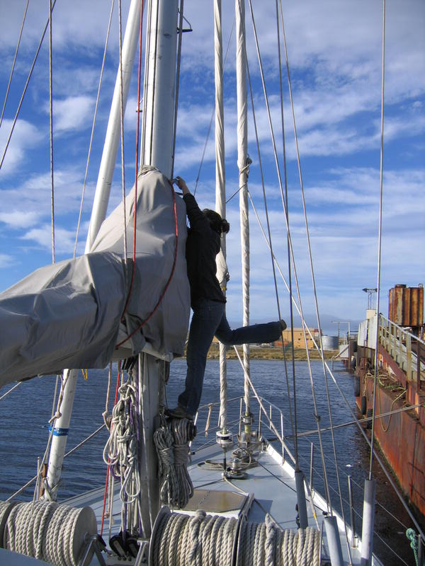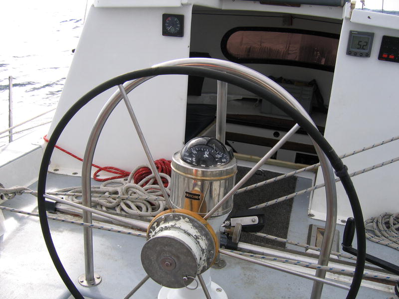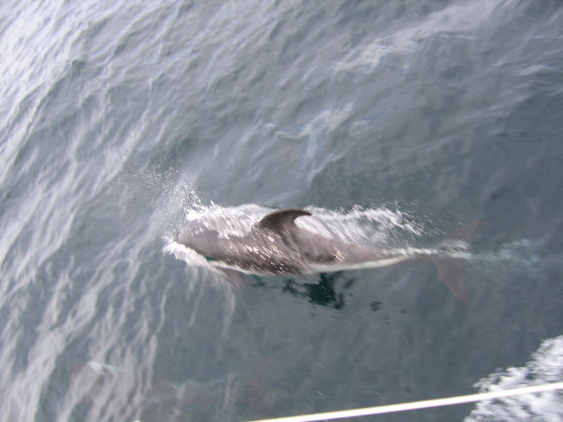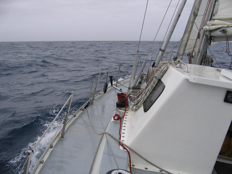 К девяти утра пришёл таможенник, поставил нам штампы в паспорта, выпил чаю, вежливо пообщался с Жизель и убыл. Колбасу принёс! Расчехляем парус, отшвартовываемся и выходим. Нас провожают дельфины. Мимо по берегам всё-всё заминировано, птички летают, травка растёт такими кочками — местное название tussaс grass. На каком-то пригорке виднеется дот с характерно торчащим крупнокалиберным пулемётом, кое-где колючая проволока, а на последнем мысу маяк. Кое где на камешках сидят птички. Короче, идиллия. Машем ручкой берегу — сюда мы вернёмся нескоро. Да и просто землю увидим через неделю, не раньше. Прощай, земля! Теперь начинается самое интересное. Ветер 20 узлов (средний), на окияне рябь. Дёргаем парус "гусиным крылом" (aka goose wing) — одну половинку паруса на одну сторону, другую на другую. Довольно редкая постановка парусов, применяется при несильном ровном попутном ветре. Мне знакомо ещё название "бабочка". И падаем, сражённые в неравной борьбе с морской болезнью. Плохо. Спасает только лежать с закрытыми глазами. Как известно, на организм в горизонтальном положении и с закрытыми глазами, морская болезнь не действует (о, это правда!). Так что часов 30 мы просто тихо лежим. Раз в 2–3 часа этот самый организм даже может себе позволить подняться по какой-нибудь надобности. Но потом быстро-быстро обратно на койку. Так и курить бросить недолго. 06.03 В океанеПосле полудня потихоньку оживаем. Ветер скис до 7–10 узлов. Так что по большей части идём на движке (парус не опускаем — помогает хоть немного и ладно). Волна тоже чуть улеглась. Светит солнышко, облаков нет. Экстремально хорошая погода. Приборы, виден поставленный "бабочкой" парус. Встретили кита, но он был далеко и видно его было плохо. Воспользовавшись ситуацией достали гитару и повыли песен, с удовольствием ужинаем — вот что значит улеглась качка. К ночи на небе вываливает Очень Много Звёзд. Здорово. Видно облака пыли в Млечном Пути, Южный Крест и миллиард-два других звёзд. С удивлением вижу среди всего этого богатства Орион. Спустя некоторое время замечаю, что он вверх тормашками. Точно, это же южное полушарие. Ещё из знакомого на небе — Сириус. Он очень яркий. 07.03 В океанеКак с ночи появился ветер (полветра, то есть боковой), так весь день погода и не менялась. Серо, пасмурно, туманно. Видимость — хорошо если метров триста (очень тяжело оценить визуально, ориентиров нету). Одна радость, что ветер ровный, постепенно раздувшийся до 18–20 узлов, посудина идёт ровно, и даже появившиеся (от ветра) волны не слишком её болтают. Наша скорость 7–7,5 узлов, но достаточно большой крен. Собственно и всё на этот день: серо, живности нету. 08.03 День рождения Клары Цеткин, всё там же в океанеДень выдался тоже серым и туманным, но! Но стала появляться живность. Рано утром народ утверждает, что видел касаток (я не видел, думаю что скорее это были дельфины). Потом днём приплыли дельфины (идентифицированы как hourglass dolphins), а где-то в половине четвёртого мы встретили действительно крупную дичь — кита. Уф! Большое. Чёрное. Капитан оценил как больше 10 метров. Предположительно Sei Whale[1]. Был довольно близко, чёрная широкая спина всплыла метрах в тридцати. Это уже крупная добыча. Несколько раз попадались скопления птичек на воде. Очевидно мы пересекли зону смешения тёплого и холодного течений (convergence line), где как раз условия самые подходящие для всякой 