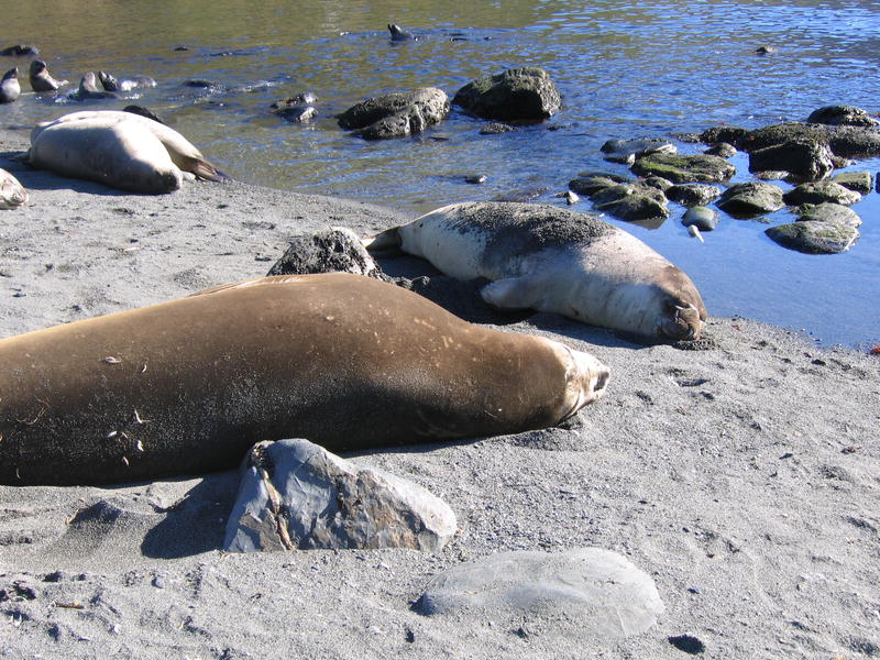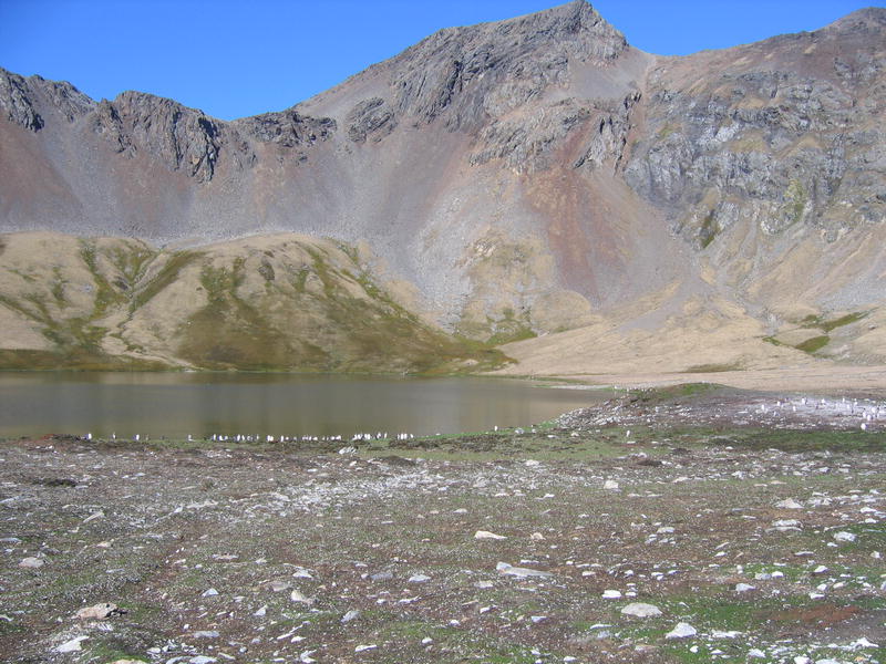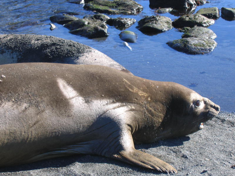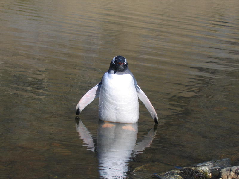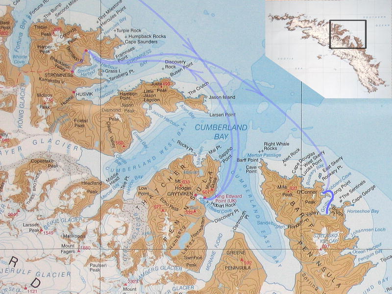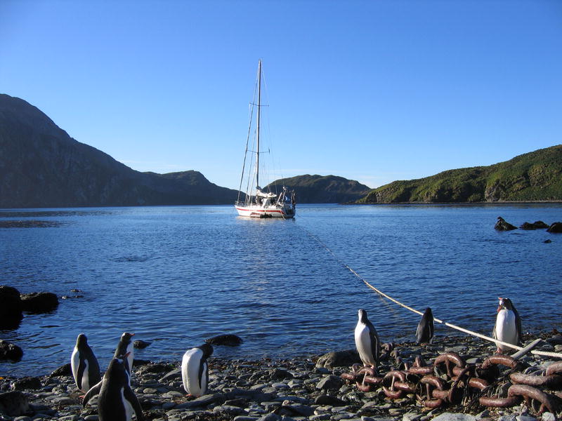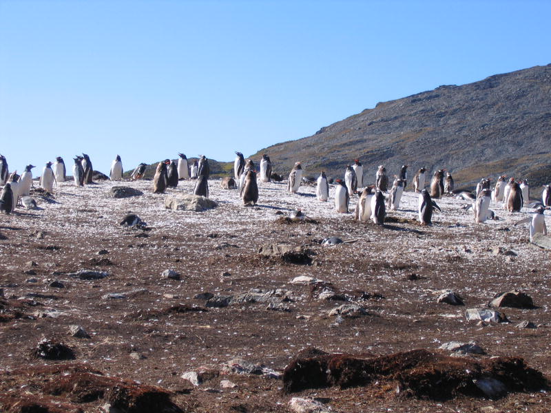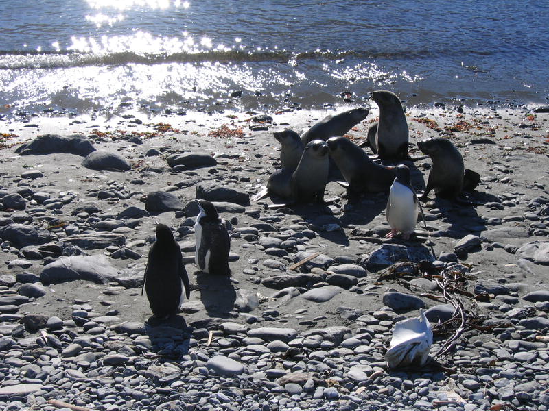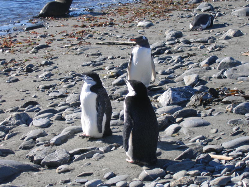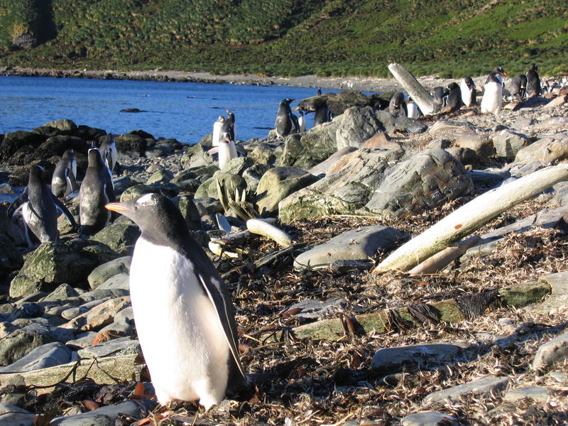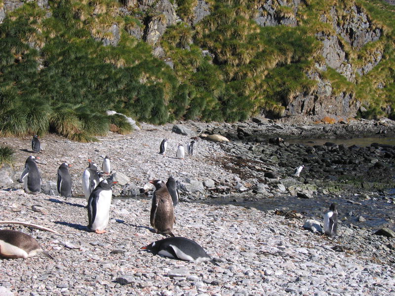 Утром пингвины в самом деле полезли вниз. Упорные создания. С утра же я слазил на ближнюю гору полюбоваться видами пока народ нырял. Панорамный вид бухты Cobblers Cove, направо вперёд бухта Godthul. Потом мы снялись с якоря и переползли в соседнюю бухту Godthul. Двумя группами: одна как обычно, на посудине, а вторая (где был я) на моторке. Немножко погоняли туда-сюда. Моторчик слабоват, но покатались с удовольствием. Заякорили посудину и я опять пошёл погулять в гору. Мимо пингвиньего озера, где один очень любопытный пингвин подошёл совсем близко посмотреть, что там такое странное. Там же я смог посмотреть на пингвинье гнёздо. Что оно собой представляет? Много перьев, ямка и пахнет. Не, у меня дом лучше, уютнее (и с диваном). Дальше был перевал с оленьими тропами, и там рядом с вершиной (на которую залез БиЛ) было обнаружено заселённое гнездо белощёкого альбатроса (Whitecheek Albatross). Альбатрос сам его выдал — прилетел, спрятался в траву и пропал. Нора норой. Внутри было видно тушку в перьях с клювом, косящий настроженный глаз, и доносился писк птенцов. На заднем плане внимательный невооружённый глаз также может разглядеть айсберг. Отсюда он кажется мелким. На обратной дороге я оглядел небольшое стадо слонов и встретил парочку редких тут пингвинов — Chinstrap Pinguins. Обратите внимание на характерную чёрную полосочку на шее, которая и дала название этому виду. Потом был барбекю на берегу (тоже заваленном китовыми костями) среди пингвинов. Пингвины (Gentoo Pinguins) ползали вокруг, плавали и прыгали в воде. А один даже запрыгнул в нашу надувную лодку, видел собственными глазами! Пришлось его веслом подталкивать, он изнутри сам выпрыгнуть не мог. [Кое-кто тоже ходил в гору, пытался там на ночь остаться. В чём был не прав, он так и не понял почему. Не, в горах ночью не ходят, тем более в отсутствие рядом вертолётов и спасателей. Стемнеет — ни зги не видно, а навернуться можно сделав буквально шаг в любом направлении.] |