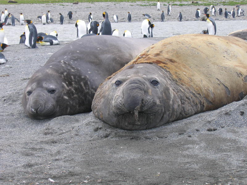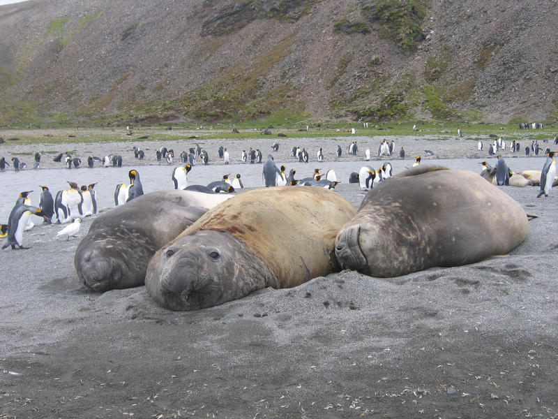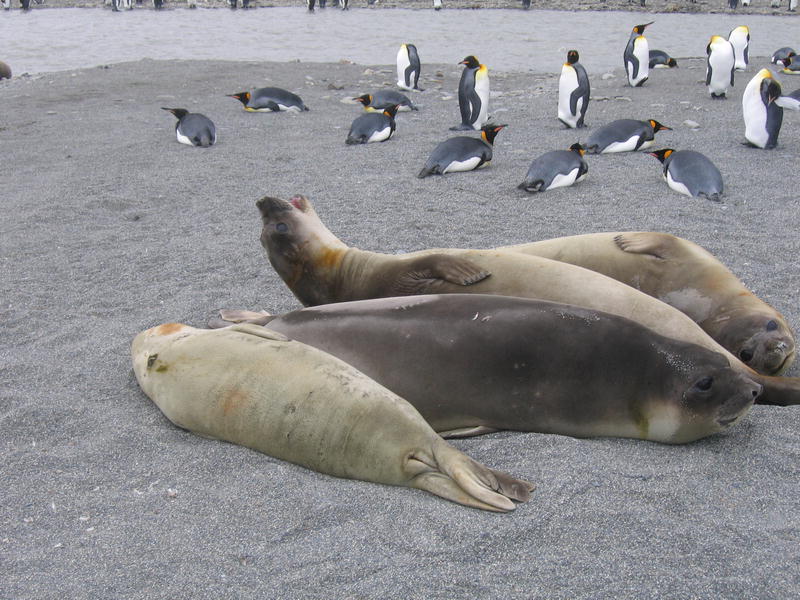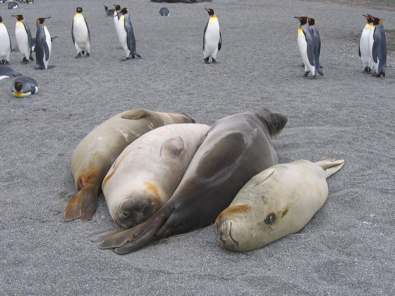 Тут же валяются слоны. Они пингвинам совсем не мешают. Самочки в